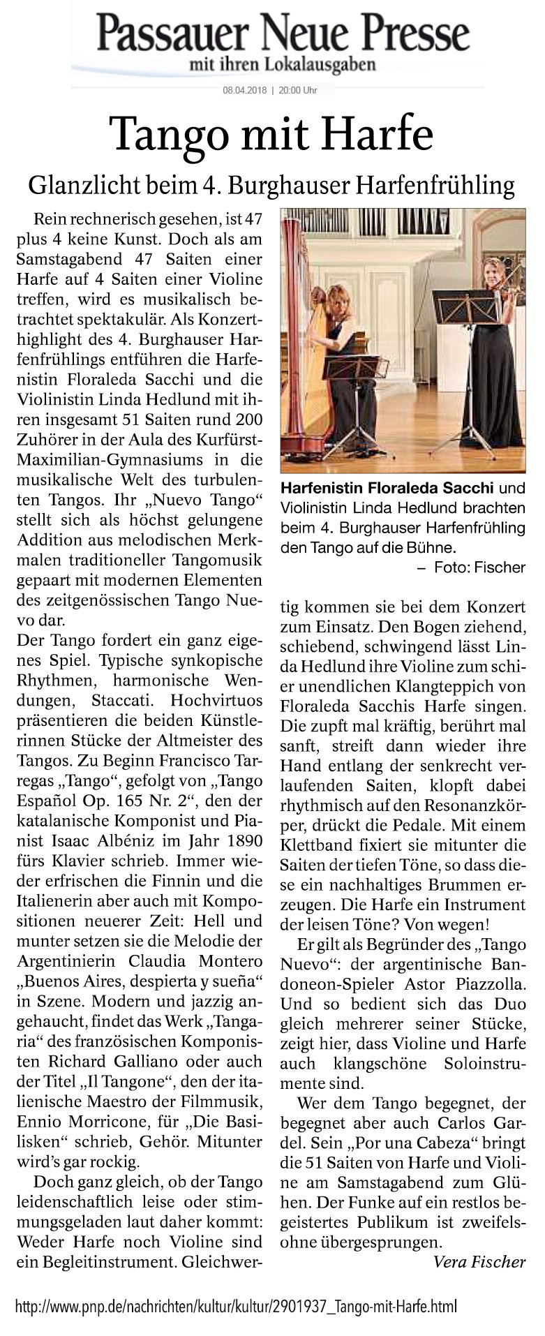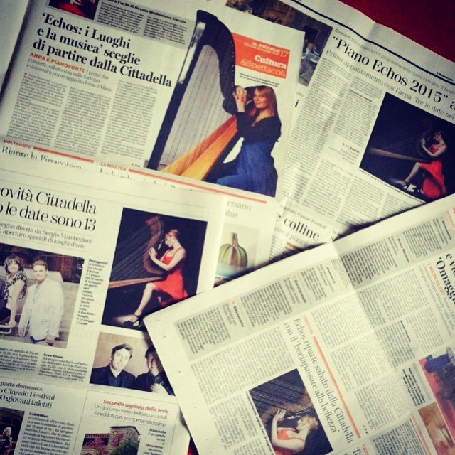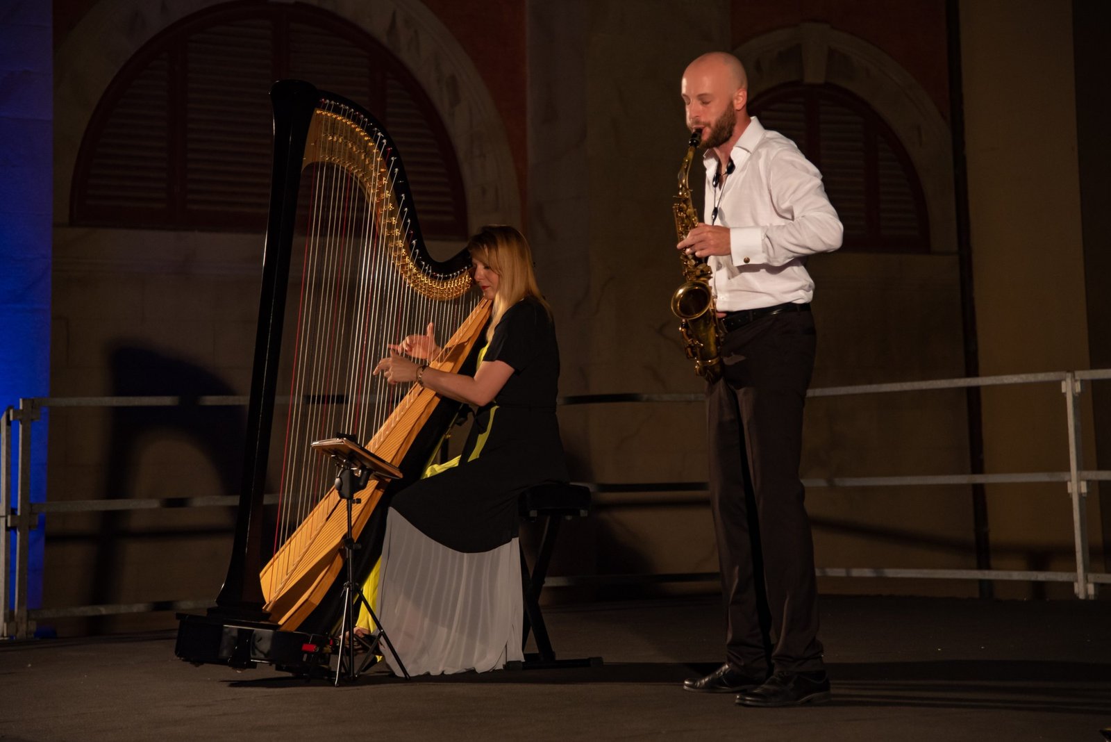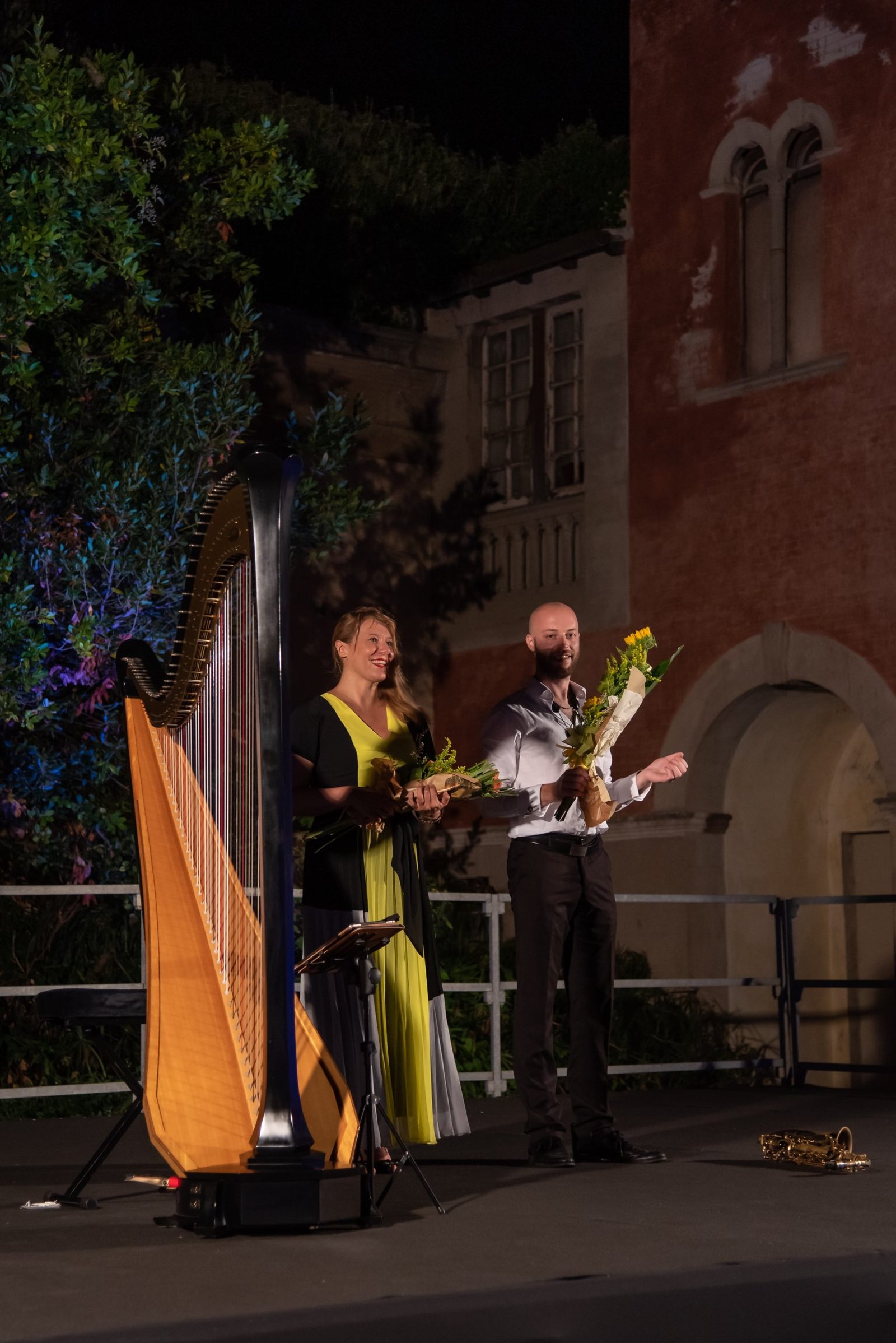 “Un concerto molto raffinato e di grande spessore con un programma che ha messo in risalto la grande musicalità e capacità comunicativa dei due artisti. Una fusione molto insolita tra l’arpa e il sassofono, che però Floraleda Sacchi e Damiano Grandesso hanno reso possibile portando i loro strumenti oltre il limite delle possibilità sonore creando un alchimia che ha incantato i presenti.” La Voce del Serchio