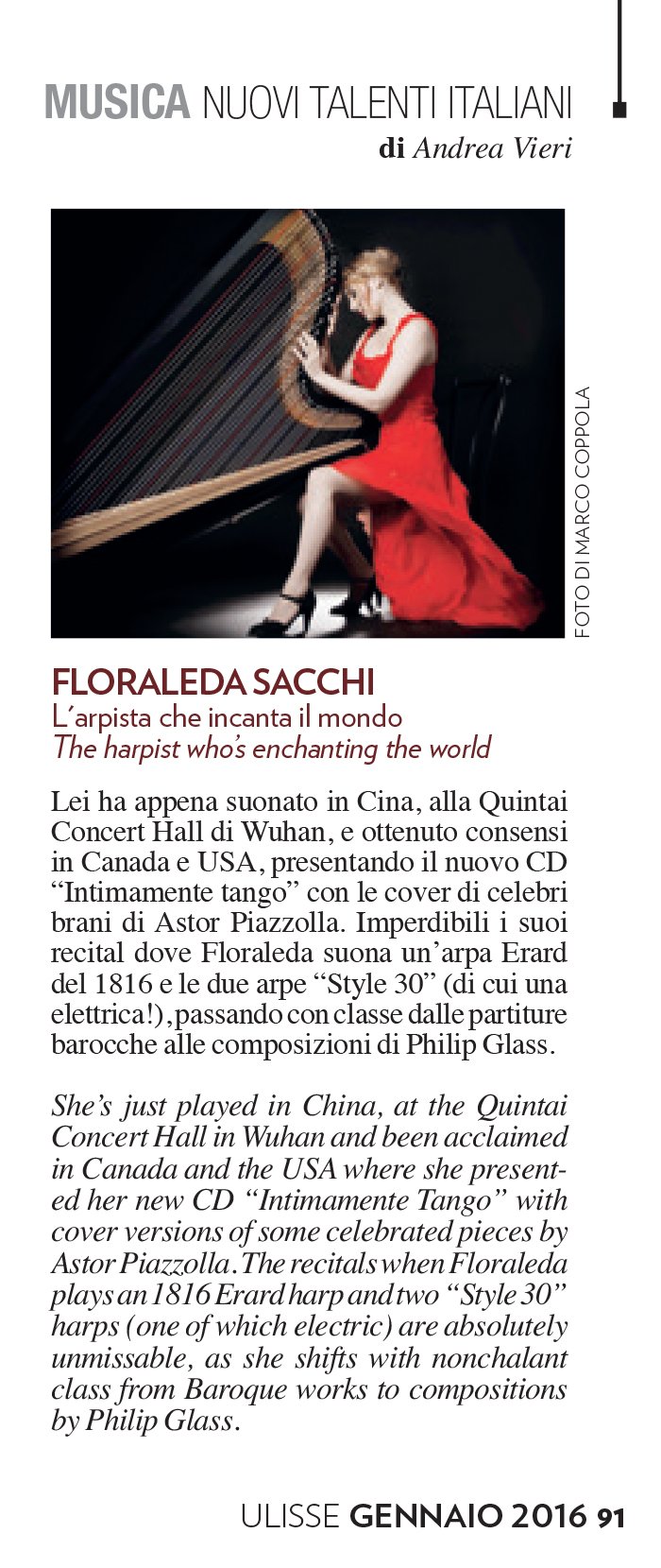 Review: “Arpın eşsiz tınılarıyla hayat bulan eserler dinleyenleri adeta büyüledi. Konserin sonunda ayakta alkışlanan İtalyan sanatçı Sacchi, iki kez daha sahneye geldi. ““Listen to the works that come to life with the unique timbre of the harp was facinating. Italian artist Floraleda Sacchi got a standing ovation at the end of the concert and came on stage twice more.”