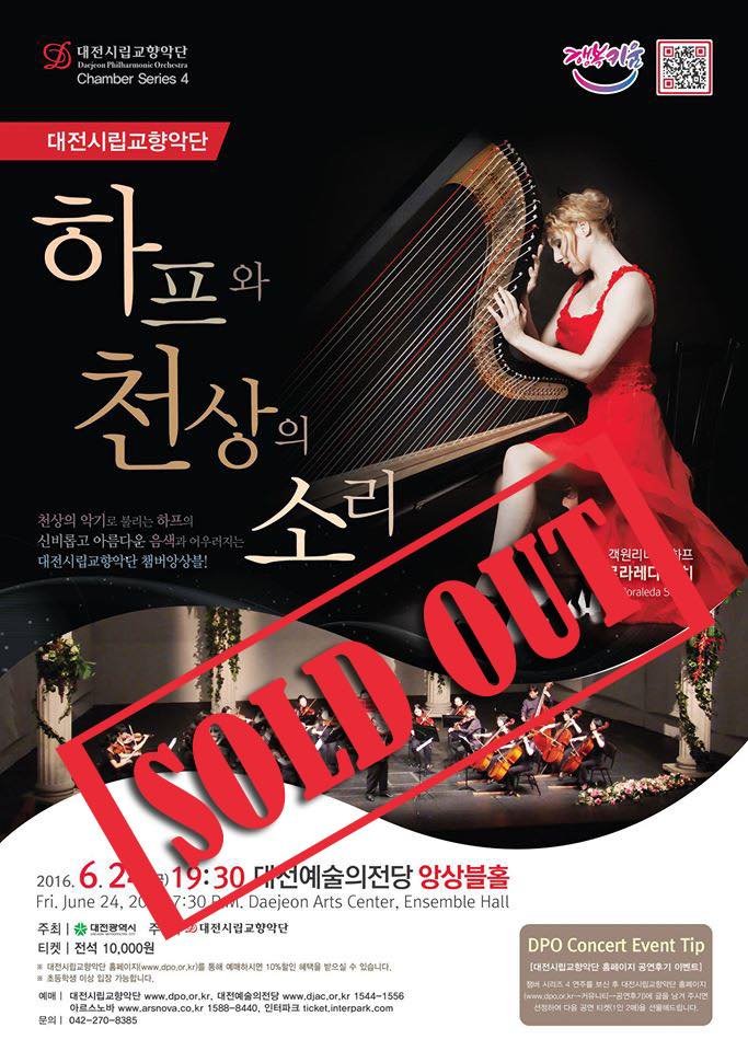 On June 24, 2016 Floraleda held a Sold Out concert in Daejeon with various ensemble combinations including some the most famous masterpieces for Harp (Pierné, Debussy, Ravel, Saint-Saëns) as well as contemporary pieces like Claudia Montero’s Harp Concerto, Bernard Andrès’ Parvis and some favorites harp solo including Philip Glass music. Flora was artist in residence for the Daejeon Philhamonic Orchestra and collaborated with all the principal parts of the orchestra.